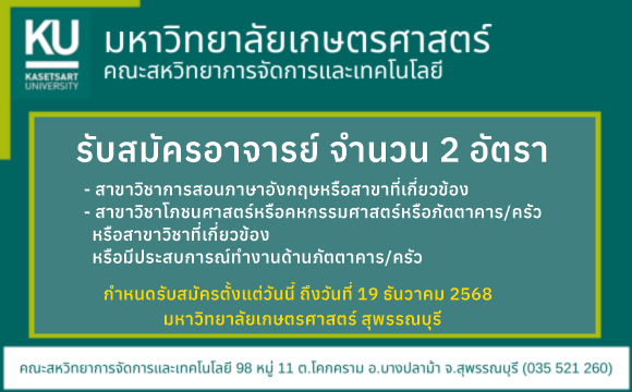 📣️📣 ประกาศคณะสหวิทยาการจัดการและเทคโนโลยี มหาวิทยาลัยเกษตรศาสตร์เรื่องรับสมัครคัดเลือกบุคคลเพื่อจ้างและแต่งตั้งเป็นพนักงานมหาวิทยาลัยกลุ่มวิชาการประเภทคณาจารย์ประจำ ตำแหน่งอาจารย์ จำนวน 2 อัตรา